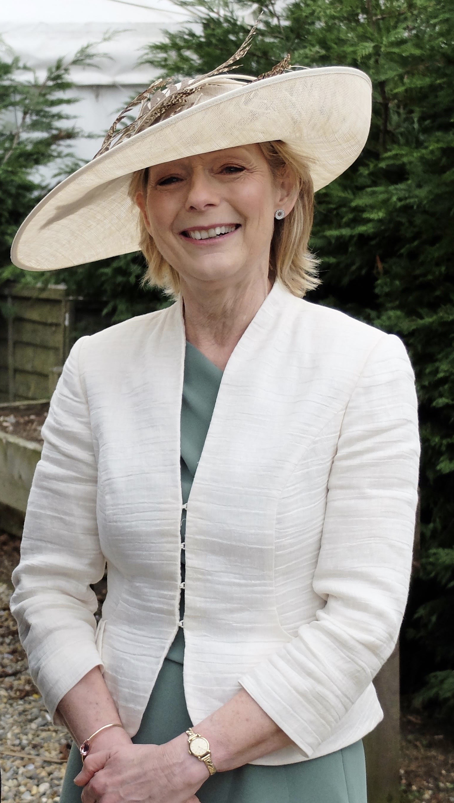 This ivory hat with gold feathers was hired to match this outfit perfectly & looked stunning.