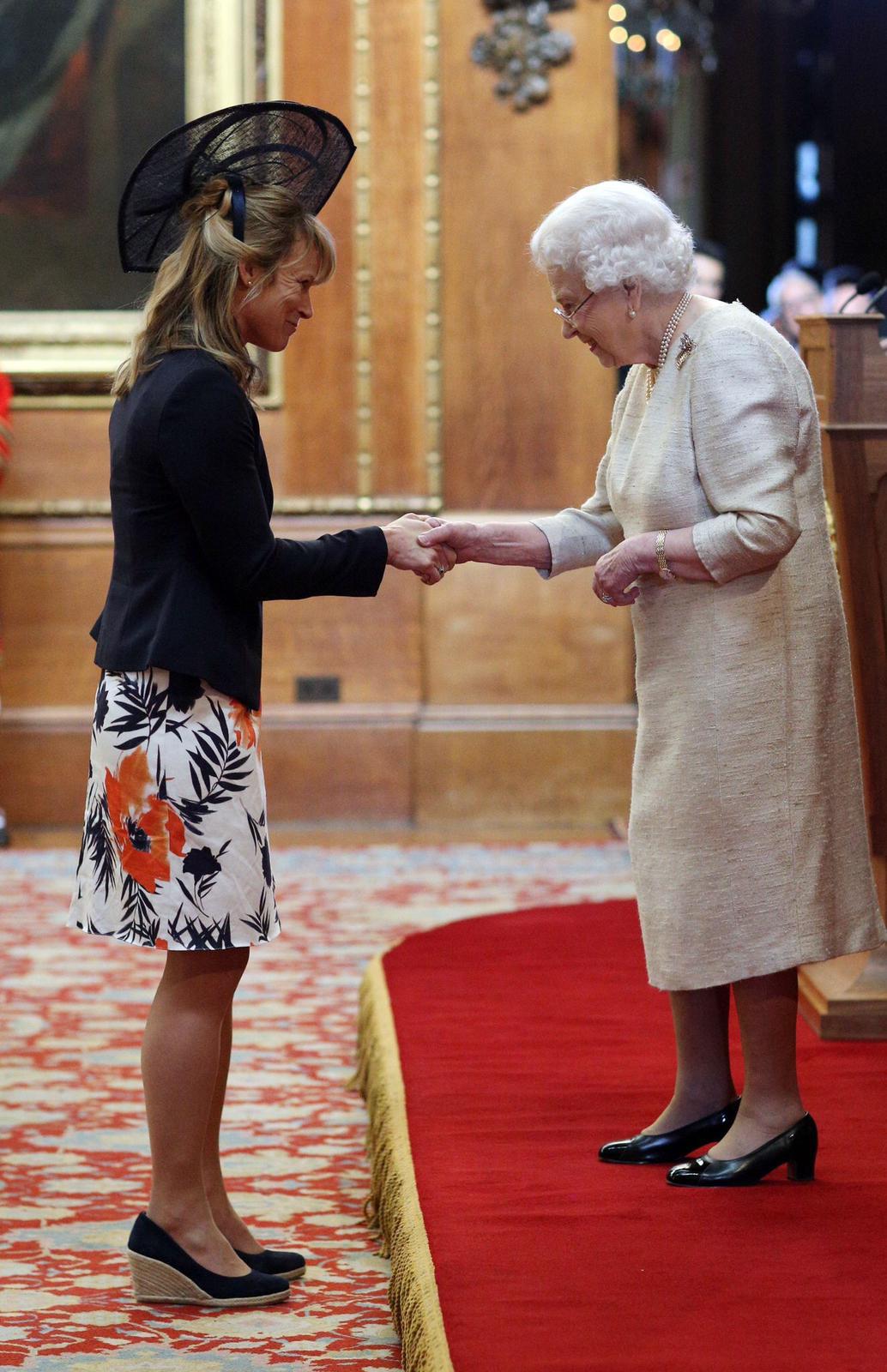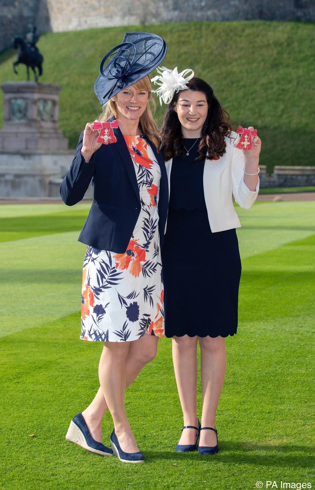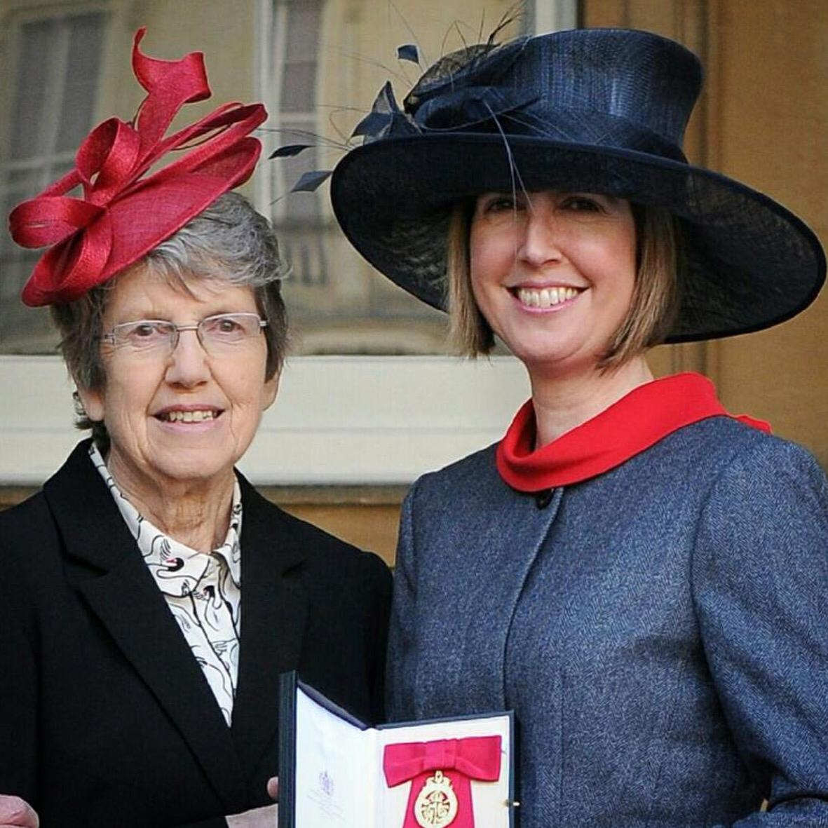 These are Jennifer Kehoe and Menna Fitzpatrick who are paralympic skiers, Menna is very partially sighted and Jennifer is her lead, They received their MBE’s from the queen at Windsor today and Jennifer is wearing a headpiece from Get Ahead Hats Reading.They have won over 20 gold and silver medals. They are the most decorated Paralympians of all time.
