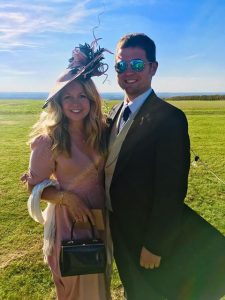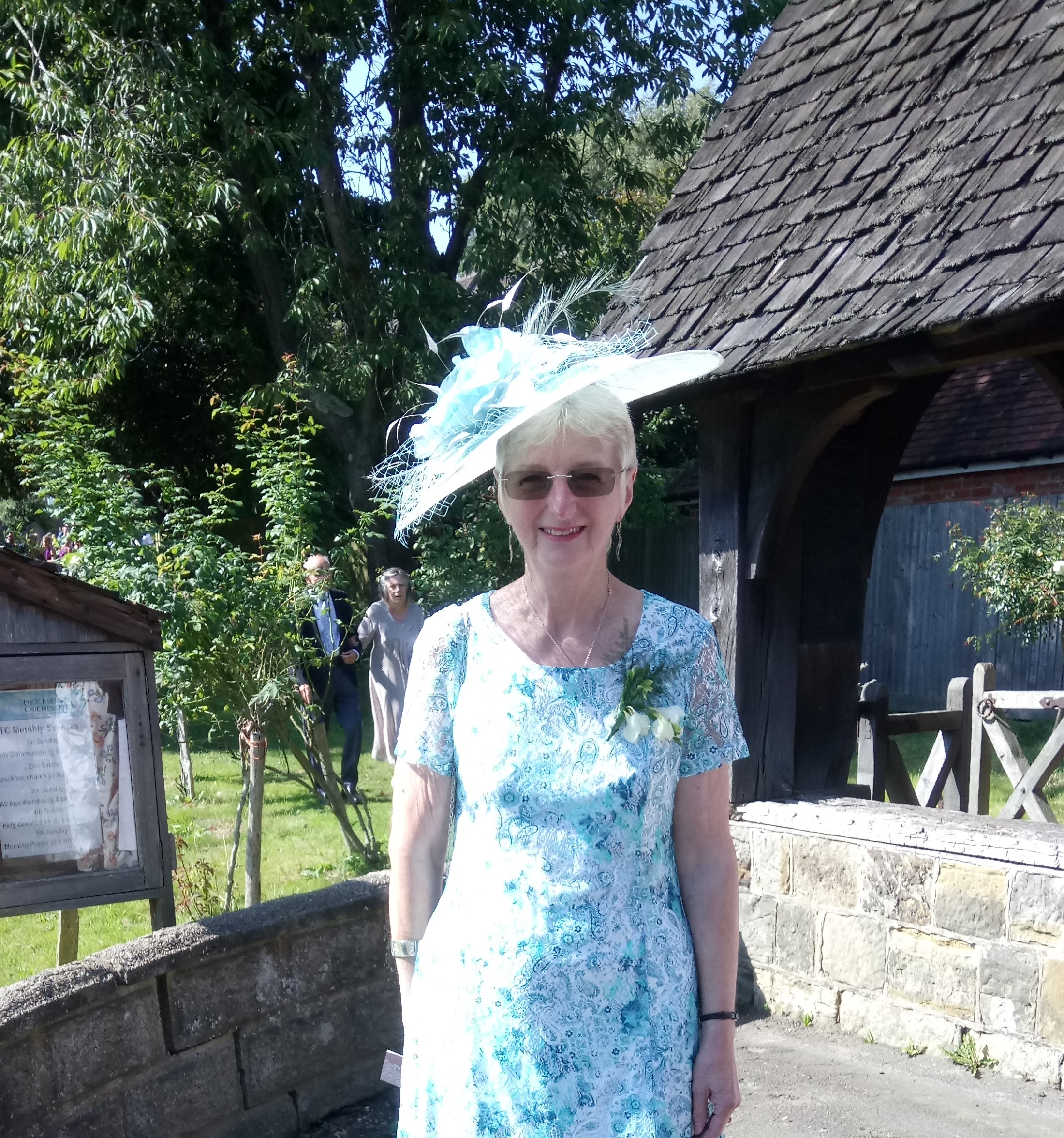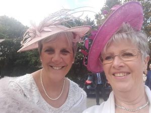 This is Kim at her son’s wedding pictured with her friend Angela at Rutland Water & both in headwear hired from Jenny at our Lincoln Showroom.