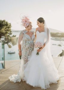 This lovely Mother & Daughter photo was taken in Ibiza , a beautiful Percher in pink to bring out the colour in the dress & match the brides bouquet .