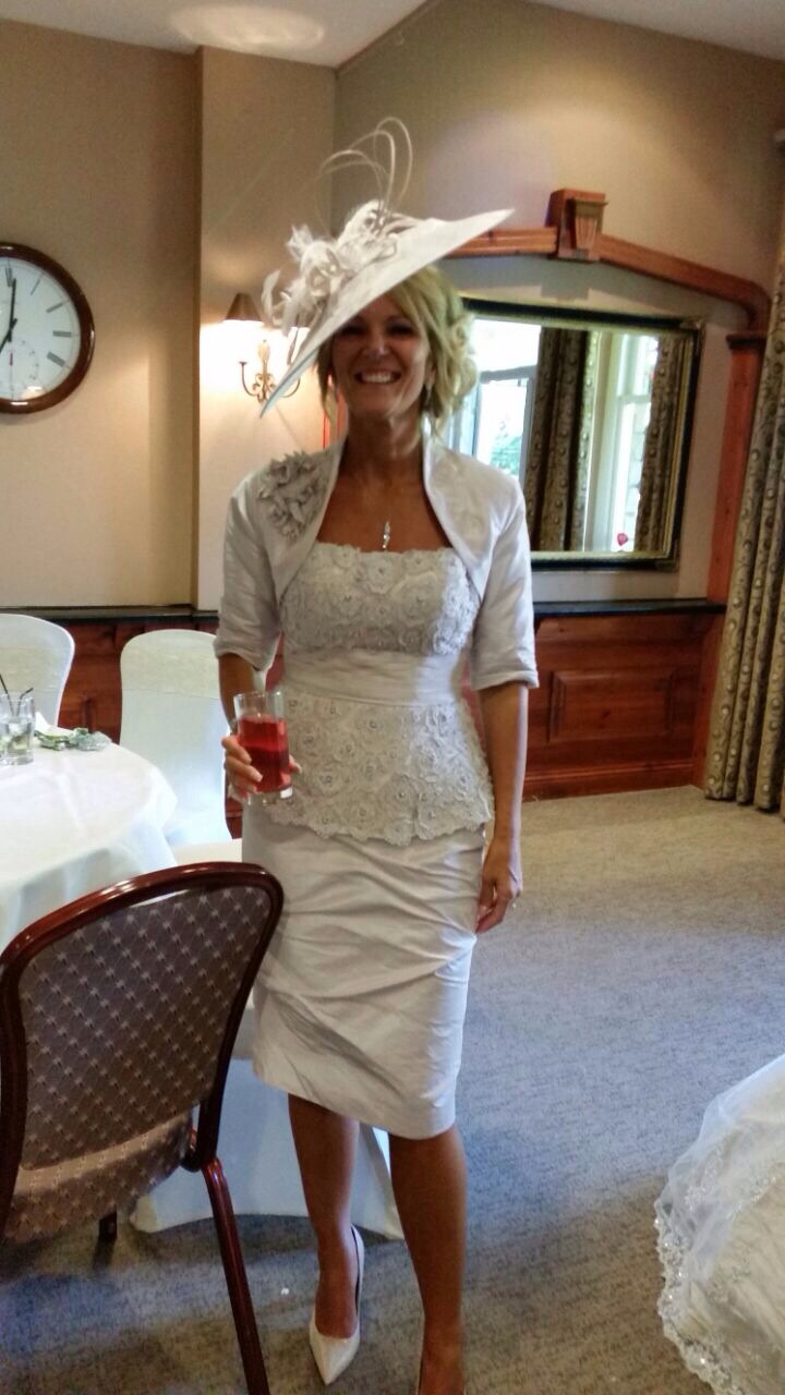 Claire Louth visited Sharon Caton’s showroom based just outside Thaxted in Essex earlier this year when she was looking for a hat for her daughter wedding. Claire found this lovely designer hat and Sharon added a few feathers to pick out her shoe and bag colour. Claire said ” It looked lovely thanks and completed the outfit for my daughter’s wedding beautifully”.