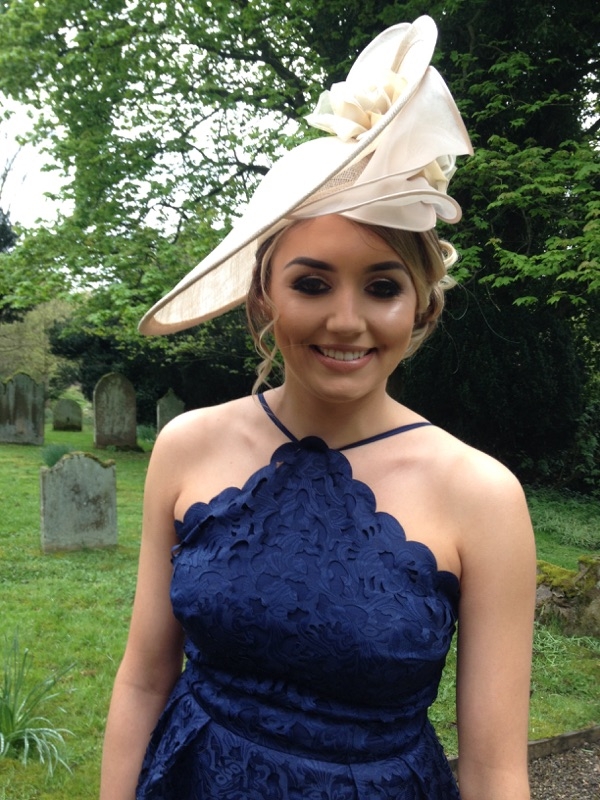 A Navy & Ivory East West Hat & an Ivory Bespoke Percher seen here complimenting the outfits perfectly.
