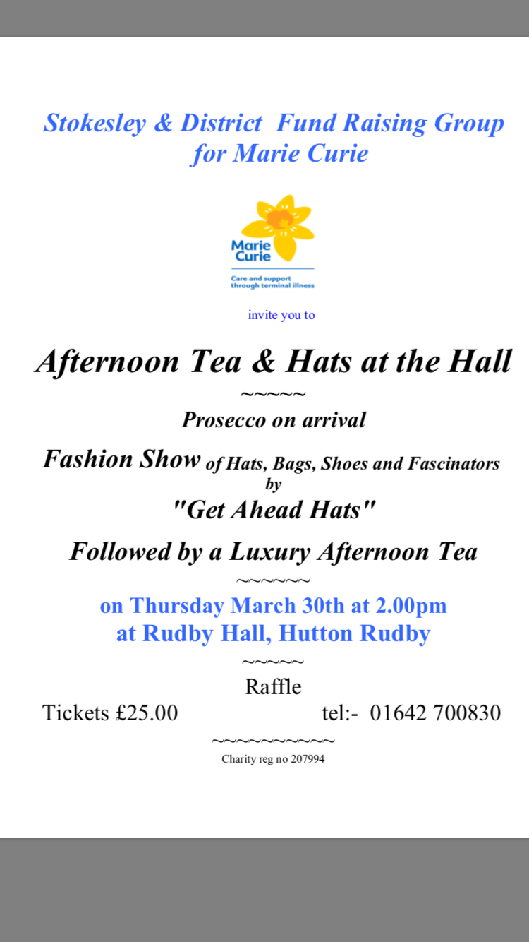 Thanks to Nicky from our Northallerton Branch for help orgainising this event in aid of Marie Curie Cancer Care ,Nicky will be showcasing all her new fabulous stock of hats and we would like as many people as possible to help support this very worthwhile cause. You will have a fab time with a brilliant fashion show and afternnon tea too!