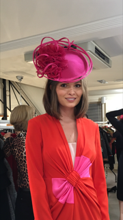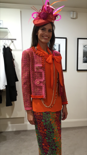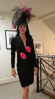 Gill is wearing a navy & white bespoke Percher hired from Sarah at our Blackburn Branch.Adding the finishing touch with this headpiece completed the outfit perfectly.