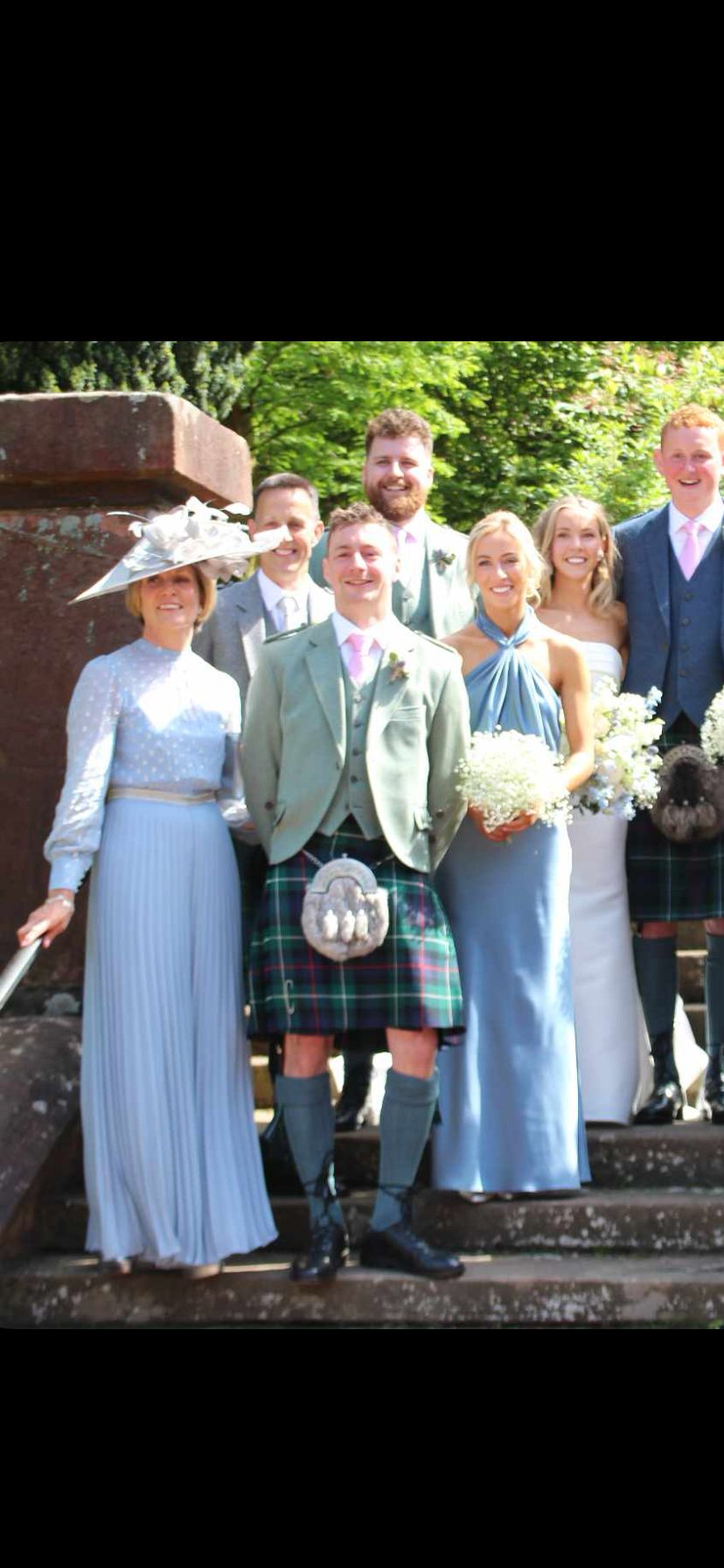 Shona wasn’t looking for a traditional Mother of the Bride look, but we think she looks fabulous in her pale blue and silver jumpsuit with large silver fascinator. We added some pale blue to the fascinator to bring it all together. What a lovely sunny day too.