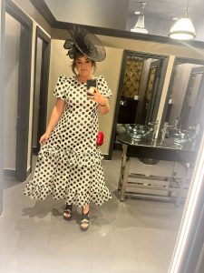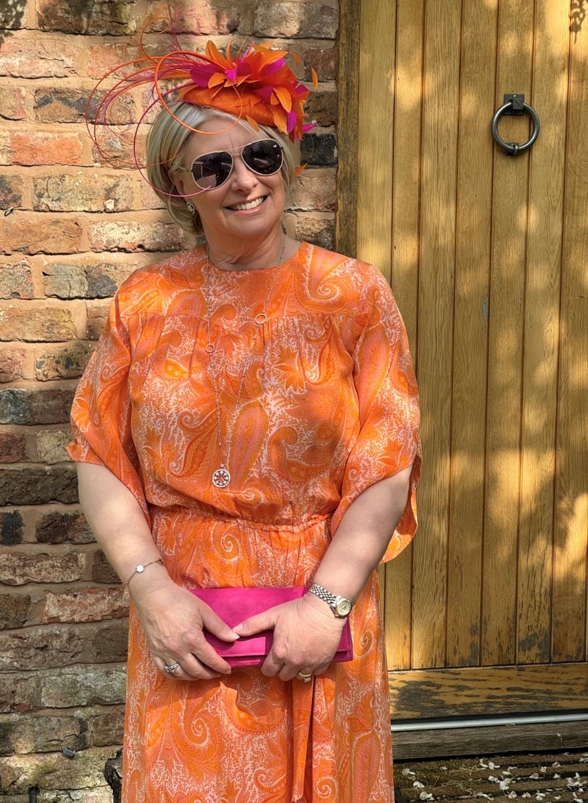 What a gorgeous photo sent in from Caroline, looking stunning in this orange and pink bespoke hat at Chester races! Always a fabulous combination and perfect for a sunny day too! Please message Louise at the Wrexham boutique to book an appointment.