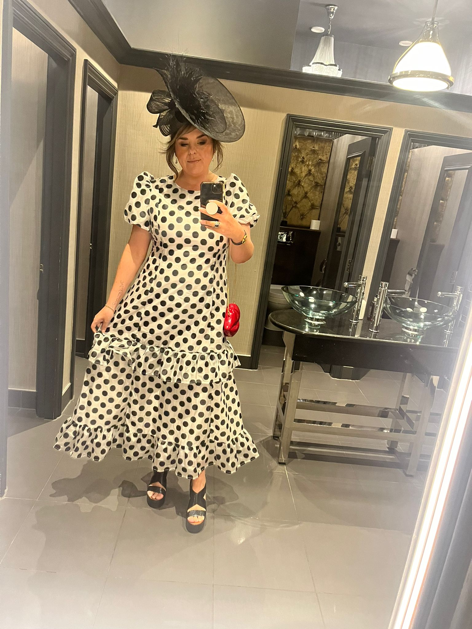 Thankyou to the lovely Helen for sending in this beautiful photo from ladies day at Chester races. Helen chose this navy light contemporary swirl headpiece with silk flower trim which was perfect with her gorgeous dress for a sunny day at the races!