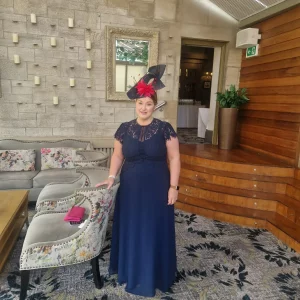 Lovely photo sent in from Mother of the Groom Anna who bought this gorgeous navy and emerald green percher from the Wrexham boutique. The perfect size for her and it looks fabulous with her navy outfit with green accessories 👌💚