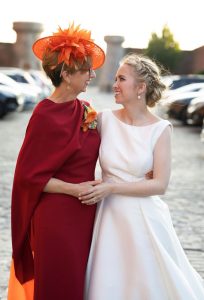 Jill chose this bespoke head piece from the Great Harwood showroom to co ordinate with the orange at bottom of her dress she had many compliments from the guests and felt amazing.