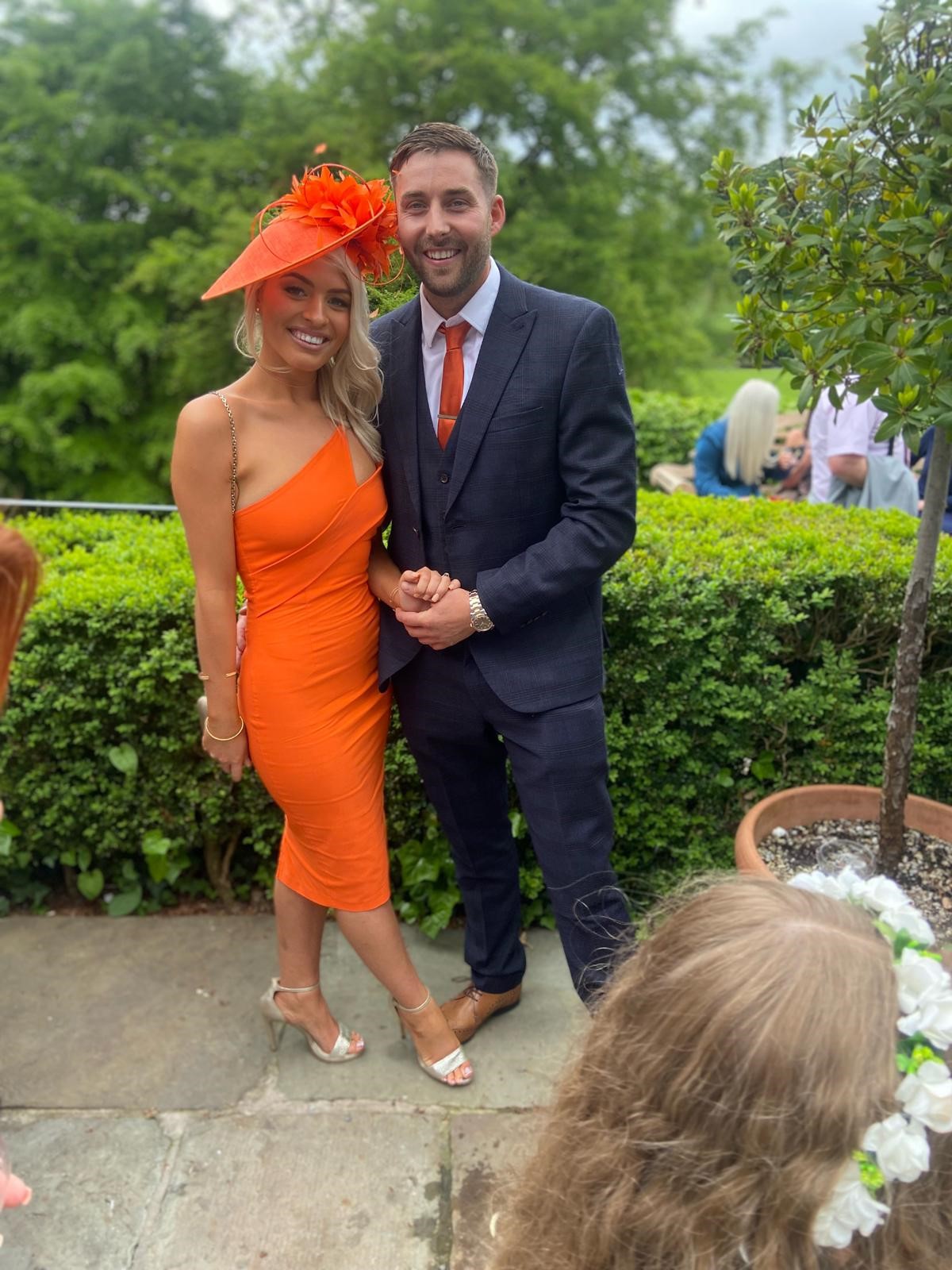 Laura and Richard looking fabulous attending Hayley and Rob’s wedding at Mytton Hall in the Ribble Valley.